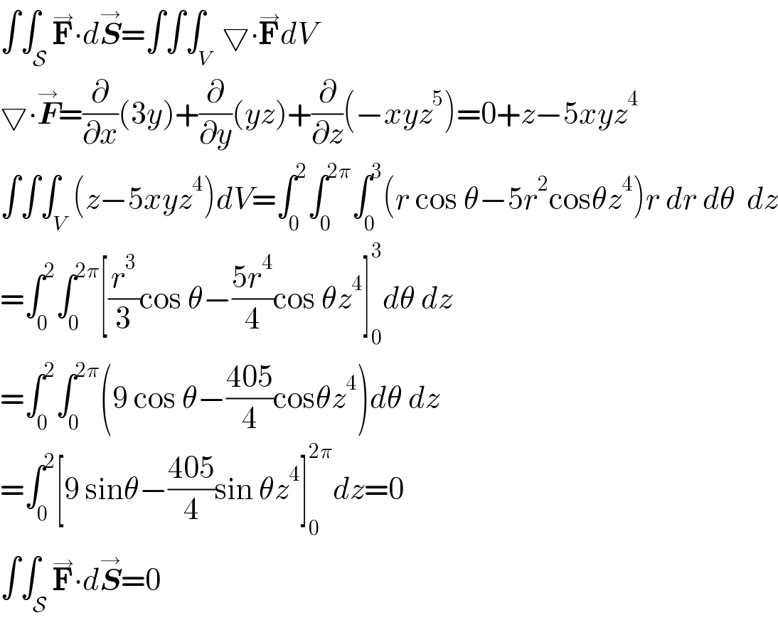 $$\int\int_{\mathcal{S}} \overset{\rightarrow} {\boldsymbol{\mathrm{F}}}\centerdot{d}\overset{\rightarrow} {\boldsymbol{{S}}}=\int\int\int_{{V}\:} \bigtriangledown\centerdot\overset{\rightarrow} {\boldsymbol{\mathrm{F}}}{dV} \\ $$$$\bigtriangledown\centerdot\overset{\rightarrow} {\boldsymbol{{F}}}=\frac{\partial}{\partial{x}}\left(\mathrm{3}{y}\right)+\frac{\partial}{\partial{y}}\left({yz}\right)+\frac{\partial}{\partial{z}}\left(−{xyz}^{\mathrm{5}} \right)=\mathrm{0}+{z}−\mathrm{5}{xyz}^{\mathrm{4}} \\ $$$$\int\int\int_{{V}} \left({z}−\mathrm{5}{xyz}^{\mathrm{4}} \right){dV}=\int_{\mathrm{0}} ^{\mathrm{2}} \int_{\mathrm{0}} ^{\mathrm{2}\pi} \int_{\mathrm{0}} ^{\mathrm{3}} \left({r}\:\mathrm{cos}\:\theta−\mathrm{5}{r}^{\mathrm{2}} \mathrm{cos}\theta{z}^{\mathrm{4}} \right){r}\:{dr}\:{d}\theta\:\:{dz} \\ $$$$=\int_{\mathrm{0}} ^{\mathrm{2}} \int_{\mathrm{0}} ^{\mathrm{2}\pi} \left[\frac{{r}^{\mathrm{3}} }{\mathrm{3}}\mathrm{cos}\:\theta−\frac{\mathrm{5}{r}^{\mathrm{4}} }{\mathrm{4}}\mathrm{cos}\:\theta{z}^{\mathrm{4}} \right]_{\mathrm{0}} ^{\mathrm{3}} {d}\theta\:{dz} \\ $$$$=\int_{\mathrm{0}} ^{\mathrm{2}} \int_{\mathrm{0}} ^{\mathrm{2}\pi} \left(\mathrm{9}\:\mathrm{cos}\:\theta−\frac{\mathrm{405}}{\mathrm{4}}\mathrm{cos}\theta{z}^{\mathrm{4}} \right){d}\theta\:{dz} \\ $$$$=\int_{\mathrm{0}} ^{\mathrm{2}} \left[\mathrm{9}\:\mathrm{sin}\theta−\frac{\mathrm{405}}{\mathrm{4}}\mathrm{sin}\:\theta{z}^{\mathrm{4}} \right]_{\mathrm{0}} ^{\mathrm{2}\pi} {dz}=\mathrm{0} \\ $$$$\int\int_{\mathcal{S}} \overset{\rightarrow} {\boldsymbol{\mathrm{F}}}\centerdot{d}\overset{\rightarrow} {\boldsymbol{{S}}}=\mathrm{0} \\ $$ | ||