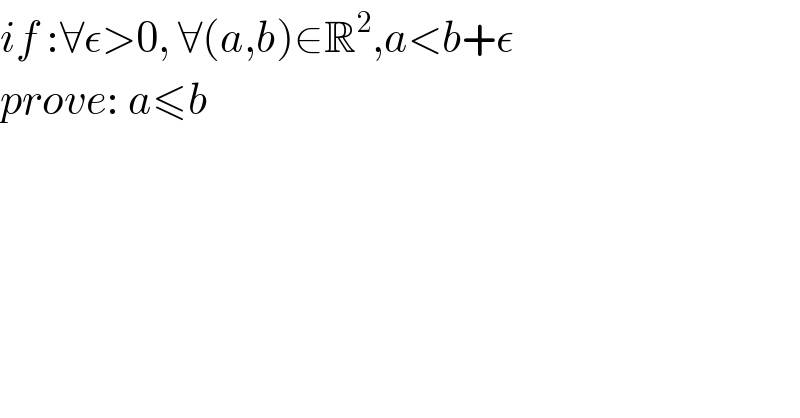 $${if}\::\forall\epsilon>\mathrm{0},\:\forall\left({a},{b}\right)\in\mathbb{R}^{\mathrm{2}} ,{a}<{b}+\epsilon \\ $$$${prove}:\:{a}\leqslant{b} \\ $$